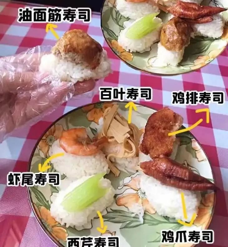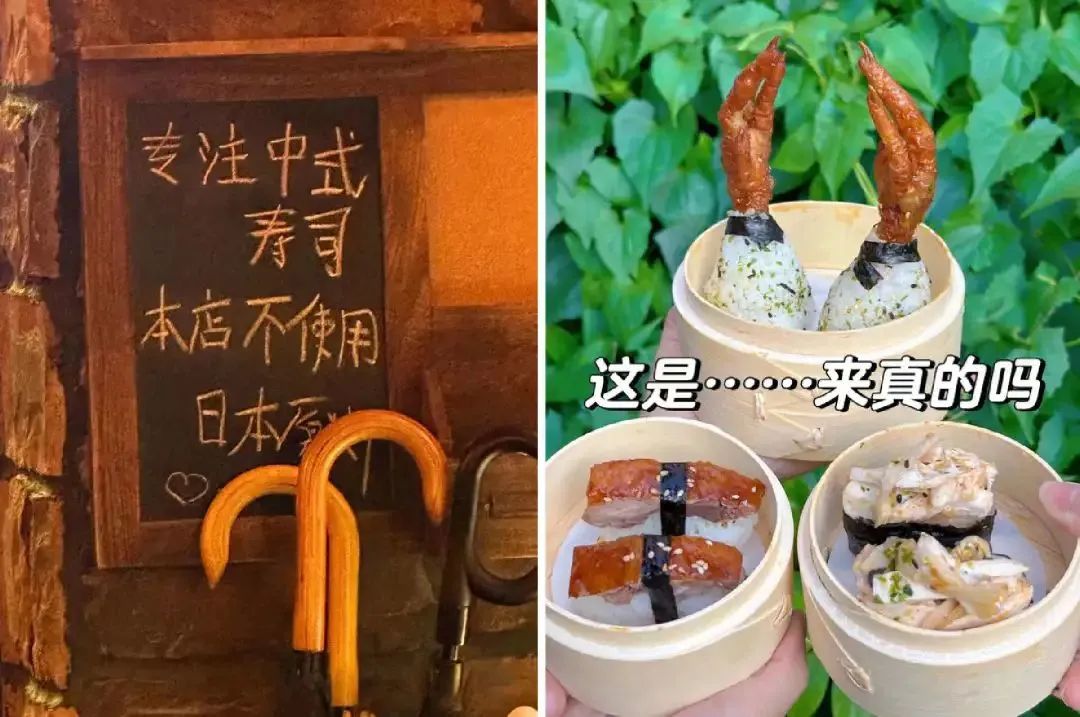 此次事件無疑又一次把日料推上了風(fēng)口浪尖,緊接著,#廣東壽司#的微博詞條沖上熱榜,相關(guān)閱讀次數(shù)超過1億。越來越多的所謂“新中式”壽司。例如白切雞壽司、蝦餃壽司、腸粉壽司、金錢肚壽司、戀愛腦壽司(腦花)、毛肚壽司、肥腸壽司、烤鴨壽司、小炒肉手握等創(chuàng)意陸續(xù)登場(chǎng)。