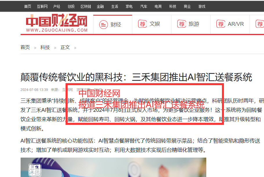 2024年7月8日,三禾集團(tuán)重磅推出的AI智匯送餐系統(tǒng)一經(jīng)發(fā)布,立即在業(yè)內(nèi)引發(fā)巨大轟動。中國網(wǎng)、中國日報網(wǎng)、新浪、科技報、中國財經(jīng)網(wǎng)等100多家中國門戶網(wǎng)站和知名媒體爭相報道這一具有里程碑意義的創(chuàng)新技術(shù)。作為全球公認(rèn)的智能餐飲設(shè)備整體解決方案服務(wù)商,經(jīng)過兩年的研發(fā),三禾集團(tuán)再次以其卓越的研發(fā)實(shí)力和前瞻性的技術(shù)布局,引領(lǐng)了智能餐飲的新風(fēng)潮。